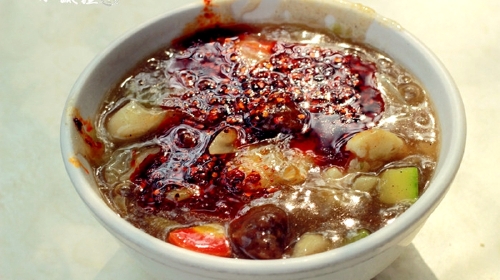 八宝稀饭真真是酸甜可口,玫瑰露的香味非常诱人。八宝稀饭里面放了瓜子、枣、莲子、花生、银耳、芝麻等等食材,非常丰富。八宝稀饭一定要趁热喝才好,稠稠的一碗喝下肚,想想都很舒服。可惜的是,八宝稀饭犹如榴莲,喜欢的人非常喜欢,吃不惯的人也是一直吃不惯的~不知道你会不会喜欢呢?
