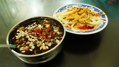 在西安,凉皮、肉夹馍、冰峰汽水三者凑在一起被称为三秦套餐,算是很地道的一种吃法。劲道的凉皮被浇上了厚厚的麻酱和辣酱,使得汤料也被染上了红艳艳的色泽,看着就非常有食欲。不过不擅长吃辣的人可以要求少放油泼辣子,多放些麻酱,这样芝麻酱的味道会更加浓郁,缓和一下辣子的味道。