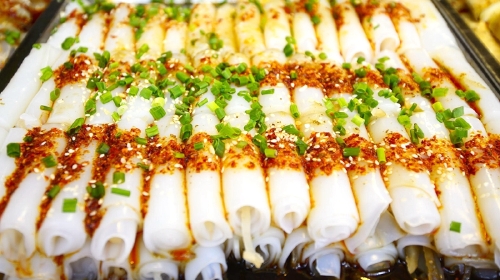 也许有人要问了,肠粉不是广州的吗?的确,肠粉来源于广州,但是在成都,你一样能吃到非常地道的肠粉,味道一点儿也不比在广州吃的肠粉差。肠粉有甜有咸,全看个人口味了。甜肠粉是用糖渍的蔬菜水果制成,外面会过上一层甜甜的糖浆;咸的肠粉品种更多一点,虾仁肠粉和牛肉肠粉*是不可错过的,爽滑鲜嫩的口感让人欲罢不能。