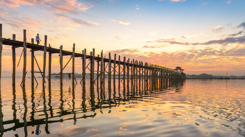 来曼德勒不会不来乌本桥。乌本桥靠近曼德勒,长达1200米,是世界上*长的柚木桥,由于材质坚硬,所以至今屹立在东塔曼湖之上。送走了这么多的日出日落,可曾见过美的平和温暖,不带一丝哀伤或者落寞的日落?乌本桥就是这样的一个存在。夕阳西下,高耸的桥面穿过回忆的长廊,波光粼粼的水面投下光的折线,在一片红霞之中留下剪影,唯美恬静在眼前缓缓绽放。乌本桥也叫“爱情桥”,桥头桥尾和桥中分别还有六座供游人休息的亭子。查看目的地攻略