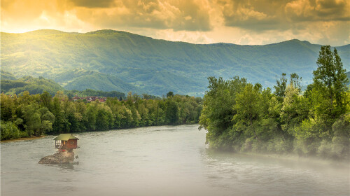 塞尔维亚巴伊纳巴什塔的一个小镇上,有一座出现在无数杂志封面的水上小屋,小屋建在德里纳河中的一块岩石上,据说是一群年轻人在1968年一起建造的,几十年来,小屋接受大自然的洗礼,甚至遇到过好几次洪水,都完好无恙,至今屹立不倒。
