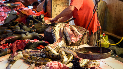 托莫洪的市场和他的美景真的是反差,话说米纳哈萨人6000年来的口味不是一般的重啊,截掉翅膀的蝙蝠,血淋淋的野猪头,扒开的大蟒蛇,甚至还有野熊。当地人很爱吃油炸老鼠(kawaok),以及味道很重辛辣的辣狗肉(rintek wuuk)等让人触目惊心的东西,不过还是有些正常的东西的,例如海鲜啦,不过看了这些小编想想还是吃印尼炒饭吧,口味猎奇的可以尝鲜下。