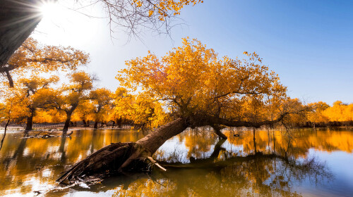如果秋天是金黄色的,那没有任何一个地方比额济纳旗更能代表秋天。“胡杨生下来千年不死,死后千年不倒,倒下去千年不朽”,小时候学过这篇课文之后就对这样一种气势恢宏的植物心生向往。长大之后看到日光下闪烁金黄色光芒的胡杨林,才知道原来它不仅仅是恢弘,还有壮美。一袭红裙点映在金黄之中,仙气十足。十一假期如果在这里留下几张照片,一定会被朋友们羡慕坏了的!