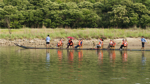 划船不用桨,也不靠浪,全靠漂,能做到这一点的就只有怀柔的汤河了。在汤河漂流,完全可以不用船桨,汤河的平均流速为1.38米/秒,桨在这里完全就是用来控制方向的。虽然水流比较慢,但是漂流河段有十余处河道和大幅度拐弯,再加上河段的宽度落差比较大,所以水流时急时缓,也会由跌宕起伏之感。