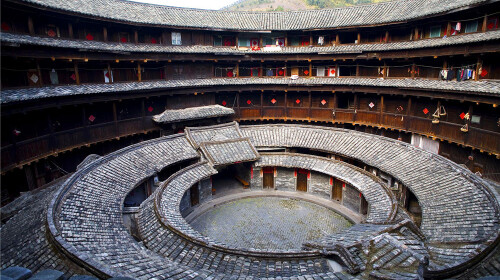 福建省南靖县西部的标志性圆形民族建筑是就是田螺坑土楼群,原是洋上坂村田螺坑自然村氏家族聚居地。田螺坑土楼群由5座形状不同的土楼组合而成,历史悠久,褐墙黑瓦错落有致,建筑别具一格,被形象的称为,“天下掉下的碟子 地上长出的蘑菇”。