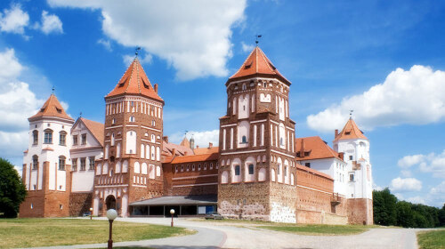 米尔城堡建筑群,历史悠久,风格独特,是中欧城堡的建筑典范,融合了哥特式文化、巴洛克式文化以及文艺复兴式文化。城堡的四周为四方形,在每个拐角处都建有塔楼,四面体的墙身和八角的塔顶,是的米尔城堡看上去十分美丽,每个塔楼上的不同装饰又给米尔城堡赋予了新的活力。天气晴朗时,蓝天白云配上倒映在水中的红色米尔城堡,显得十分妩媚动人。