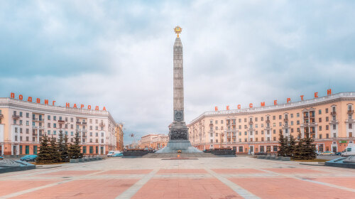 胜利广场坐落于明斯克市的中心,1947年建成,长225米,宽175米,是白罗斯巨型隆重纪念活动的主要场所之一。广场上伫立着伟大卫国战争阵亡烈士纪念碑,备前是体现烈士不朽精神的长明圣火。胜利广场两侧整齐排列的是悲伤则刻着前苏联12个英雄城市的名称。广场地下的人行信道中央大厅还建有一个直径长达2米的琥珀花环,当花环内的灯光亮起时,犹如一团火焰。