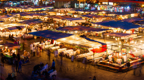 在马拉喀什,不得不去的就是Dejemma el-Fna广场,逛逛夜市,这个广场是马拉喀什的核心,被评为联合国文化遗产,被称为open- air theatre。所以马拉喀什夜市非常有名。广场商贩云集,干鲜瓜果种类齐全,日用百货琳琅满目,每天从日出经营到深夜,风雨无阻,故号称不眠广场夜市。到了晚上,广场上的食品摊点开张使得广场变为了一个空前热闹的露天餐厅。查看目的地攻略