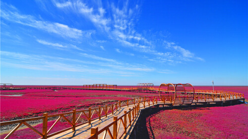 辽河三角洲盘锦拥有世界面积*保存*完好的芦苇荡。*特别的是那举世罕见的红海滩,鲜艳的红色碱蓬草覆盖了整片河水,令人叹为观止。站在桥上,欣赏远处的景色,中央上假乌龟和假螃蟹的模型甚是可爱,海鸥和丹顶鹤仿佛是这里的熟客,时不时的停下来栖息觅食。柔美绚丽的三角洲*是个一家人出游踏青的好地方。查看目的地攻略