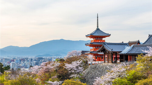*赏樱时间:3月底4月初 清水寺是京都*的千年寺庙,京都的地标,也是京都的赏樱名地,红色的寺庙、朱红色的山门和粉色的樱花奇妙的很搭。顺着山坡而上,樱花树散布期间,穿着和服的少女,也若粉色樱花一般娇媚,站在本堂大殿的大舞台俯瞰漫山的樱花,一片片绯红。不少人还会来夜间观拜赏樱,灯光下的樱花更加的绚烂迷幻,让人沉醉。查看目的地攻略