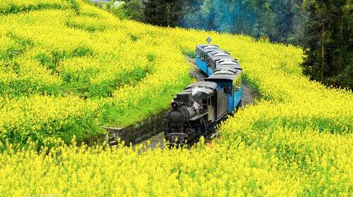山野里每天都有着清脆的汽笛声回荡,——乌拉乌拉,小火车行驶在山间的小路里,一不小心就从身旁擦肩而过,仿佛是一场火车奇遇记。每年三月便是嘉阳小火车*的时节,小火车穿行在金色花海里,清风拂过的菜籽花香,比千与千寻的小火车还要美妙。查看目的地攻略