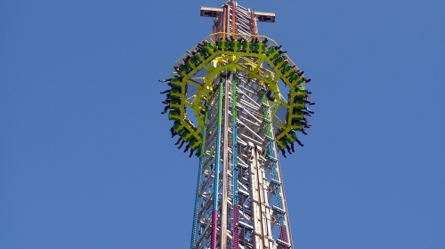 这个通天塔,通俗点说就是跳楼机,跟美国的“升天电梯”有点像。等你坐好后,什么缓冲都没有,就这样突然刷地一下把你送上了天, 等你以为已经到顶了,想要睁开眼睛,顺便擦下眼泪,它又刷的一下上去了,哭爹啊。到80米高空后,又突然开始加速自由下落,几秒钟让你冲到底,超重失重什么的都一起体验了。常常有很多排队的人排着排着就会被吓跑。查看目的地攻略
