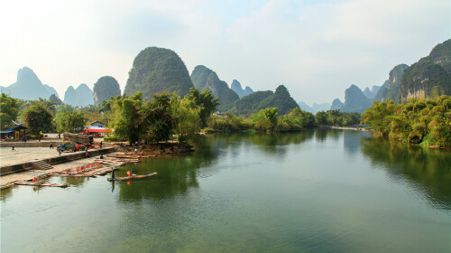 从杨堤到兴坪这一段为漓江风景*漂亮也是**的一段,九马画山、黄布倒影都在这一段,新版人民币20元的背面就是黄布倒影风景,乘上竹筏,饱览漓江的山水风光,群山葱郁,水如翡翠,一副水墨画卷慢慢在你眼前展开,真是“舟行碧波上,人在画中游”。玩多了刺激的漂流也感受下文艺的漂流方式。