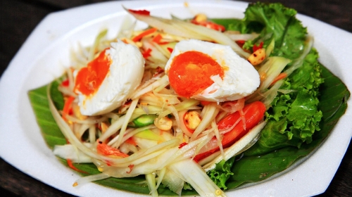 青木瓜沙拉是非常适合泰国海岛气候的一道美食,家家户户只要有一个木质小桶搅拌就能轻松简单地做出来。新鲜的青木瓜切成丝,撒上虾米、爆香的花生、西红柿、鱼露、青豆,再加以鲜榨的柠檬汁、辣椒、糖、蒜调味,酸甜香辣的口味清爽又不显平淡,是平民美食中数一数二不可多得的美味!