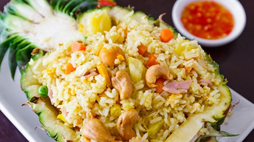 菠萝炒饭可以算是泰国菜的*了,在甲米当然也是随处可见。菠萝半个填上米饭,拌着甜甜的红椒黄椒、洋葱、虾仁、鱿鱼、青豆、玉米,食材多多让人觉得一本满足!水果、海鲜和米饭的搭配总是能够互取所长、互补所短,味道也是海鲜的鲜美中渗透着菠萝的甜味,咸咸甜甜的味道不知抓住了多少人的心~