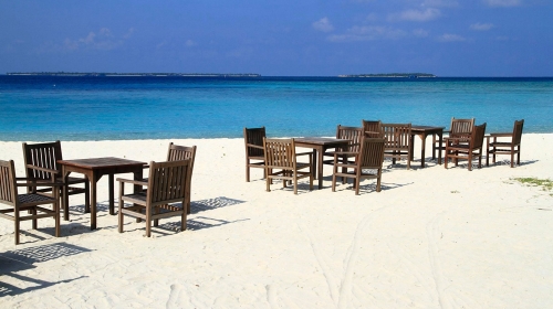 木器的桌椅,精致的餐具,低调而不奢华,大气而有感觉。在日落时分,蓝天的色彩多了一份暗沉,火红的晚霞在日落处绚烂着,一边用餐,一边观看海边日落。或者在晚上,繁星闪烁的时候,餐桌摆设在海中央,还有浪漫的烛光点缀四周,在这迷人夜色中,与爱人执手相看,一眼便是永远。