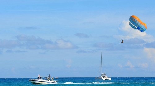 海上拖伞是一项非常有趣的水上运动。起飞前,你需要穿好降落伞,系好拖绳,拖绳的另一端被紧紧拴在快艇上。当快艇启动后,随着速度的加快,穿着降落伞的你会越升越高。降落伞在空中绽开时,你会产生一种飞翔的快感。远处的青山,脚下的海水,都像电影里不停转换的画面,一幕幕飞快闪过。查看目的地攻略