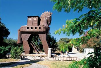 特洛伊,曾是古希腊殖民城市,公元前16世纪前后由古希腊人所建。位于土耳其恰纳卡莱南部,北临达达尼尔海峡,西抵小亚细亚半岛,坐落在平缓的城堡山脚下。虽然特洛伊古城早已废弃,但这里依旧山峦青翠,流水潺潺,红瓦白墙的农舍点缀其间,这是特洛伊之城,吸引你来恰纳卡莱的也许就是那个传奇的故事—特洛伊木马。