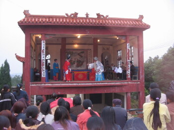 信州区、婺源民间每有婚嫁寿诞等喜事,都会请串堂班在宴席间演奏,场面十分热闹。客人边吃喝边听奏乐,别有一番趣味。串堂班是一种民间音乐组织,成员一般六到八人,有的是以此为生的乐队,有的是农闲时临时邀集而 成,如今基本上是后一种。串堂班有大锣、云锣、小锣、鼓、钹、唢呐、笛子、二胡、京胡、三弦等乐器。每人擅长二三种乐器,班主由文、武场技巧全面者担任。打击乐器固定在一个特制的担子上面,可挑可拆,便于串堂。大户人家婚娶寿诞,为求吉庆热闹,必请串堂班。除礼仪有固定的乐曲外,宴请宾客时,亦请串堂班伴奏,以示对宾客的尊重和主人富有。有时,逢村族喜庆或私人""堂会""等场面大而隆重的活动,串堂班亦可唱戏。乐者担任戏中某个或几个角色,生旦丑末净唱念兼备。腔调有微腔、京腔、黄梅戏。