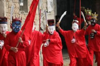 江西南丰的“跳竹马”是表演花关索(又称关索)与鲍三娘、关公与周仓对阵的一种傩舞。因上述4将腹前安有木质小马头(周仓为小狮头),腰后用竹片弓成半弧,以战袍后襟复盖,故称“跳竹马”。每年春节期间活动,到各家驱邪逐疫 。先是开山舞旗,次为花关索执长抢与鲍三娘舞双刀比武,再是关公舞刀与周仓执戟比武,演员一脚趿起,一脚着地跳跃,表示马的奔跑。然后花、鲍、关、周4人同时对阵,不分胜负结束。有的竹马班在花、鲍对阵前,加两个先锋步战,或是打旗与承旗对棍,或是五道将军与连山太子对棍。表演时,许多乡民向竹马撒谷糠,俗称“撒粮”,表示喂饱神马,好驱鬼妖。清代后期,战乱不断,南丰乡民希望“跳竹马”能驱兵祸,便在2 名锣手伴奏的助阵锣声下进行舞蹈,以寓意“鸣锣收兵,天下太平”。有的乡民怕“跳竹马”时掉武器,成为刀兵之灾的象征,不“跳竹马”而给香火钱,希望“刀枪入库,马放南山”。南丰竹马舞,寄托着乡民向往和平,祈求安定的美好愿望。