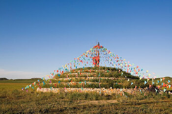 祭敖包是蒙古民族传统的习俗,是蒙古民族盛大的祭祀活动之一,在每年水草丰美时节举行,在地面开阔、风景优美的山地高处,用石头堆一座圆形实心塔,顶端立系有经文布条或牲畜毛角的长杆。届时,供祭熟牛羊肉,主持人致祷告词,男女老少膜拜祈祷,祈求风调雨顺、人畜平安。祭祀仪式结束后,常举行赛马、射箭、摔跤等竞技活动。