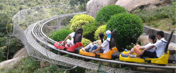 石景山公园里配备有山地冲锋车,它是一条管轨式滑道,全长650米,平均倾斜度10.2度,平均离地高度0.8米,速度由乘客自己控制,可快可慢,安全舒适。不满足于乘坐缆车下山的游客可以体验这种新潮刺激的冲锋车。