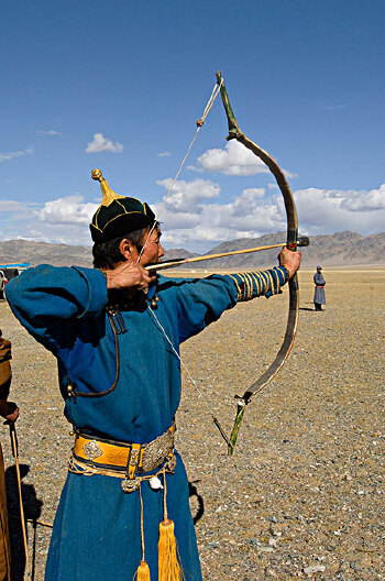 射箭双赛是男子汉的一大荣耀,一般距离70或45弓。弓身外用竹片,内衬角片制成。两角儿相接处是坚木做成的把儿。弓的两端用皮筋弦打紧。用于比赛的弓,其强度为25弦或50弦。箭用柳条做杆,鹰羽做尾,长3尺。
