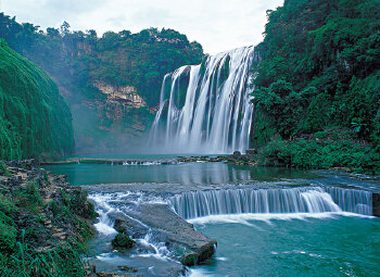 黄果树瀑布是世界上颇富盛名的大瀑布之一。这里也是全世界唯一一个可以从前后左右里外上下都能观赏的瀑布。巨大瀑崖上轰然坠入十七米深的犀牛滩中,声如巨雷,山鸣谷应,气度恢弘,气象万千,摄人心魄。