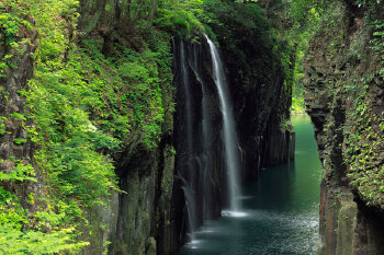 高千穗峡是由阿苏熔岩的侵蚀而形成的高达80米至100米的V字型柱状节理断崖。在高千穗峡上比较著名的另一个景点是17米高的真名井瀑布,周围山青水秀,峡谷内水质清澈,泛舟其中别有一番情调。