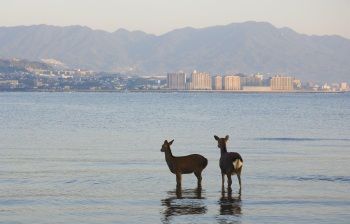 宫岛,又称为严岛,与宫城县的松岛、京都府的天桥立并列为“日本三景”。它以严岛神社及其满潮时立于大海中的朱红色鸟居最为著名。在宫岛上最具特色的就是鹿在岛上自由出没,野生鹿在街道上与游人伴行,十分有当地特色。