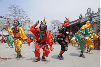 傩戏是旧时迎神赛会、驱逐疫鬼的一种仪式,即事主家有所求之事就向神许下愿心,愿心已了就由巫师代事主家向神还愿。演出时以三五人头戴木制面具,一人主唱,众人合之,随着锣鼓的伴奏且唱且跳,虽动作呆板而不失风趣诙谐,歌腔单调却也词粗理正。