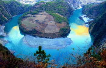 怒江流经丙中洛乡日丹村附近,因被王箐大悬岩绝壁阻隔,江水流向自原来的北南流向改为东西流向,流出300多米后,又被丹拉大山隔断,再次调头由西向东急转,于是形成了半圆形大湾,即为怒江第 一湾。徒步登上贡当神山山顶,气势磅礴,震撼人心,摄影爱好者们可千瓦不要错过。