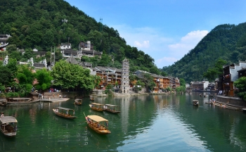 古苗河的两岸山峰耸峙,顺环山腰而建的扶梯木板路向景区深处前行,一路风景殊绝,有白水河、“雄狮迎驾”、“蚩尤巡疆”和“天兵天将”、“万卷天书”以及融险美于一身的七梯岩瀑布等景点,传说这些景点全是由战神蚩尤及他的部下和女儿幻化而成。
