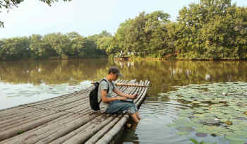 云台山的竹筏漂流位置在潭瀑峡、泉瀑峡景点的入口处小广场旁的河里。这个河道是这个景区的一个景点之一,长年河水不断,倒映周围山林美景。撑着竹筏慢慢悠悠漂在水中,时时吹来一阵暖风,怡然而惬意。