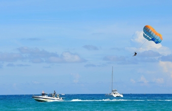 长滩岛似乎总是能够让你在不一样的空间时间去体验美丽的风景呢!降落伞与快艇连接,通过快艇在海面快速行驶的速度撑开降落伞,让背上背着降落伞的人飞到空中,这个时候在空中看到的风景又是另一番滋味。到达高点之后,船家会让降落伞缓缓下落到水面,再加速拉起,整个过程十分刺激,恐高的同志就不建议啦~