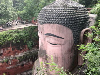 乐山大佛,又名凌云大佛,为弥勒佛坐像,端然正坐在大渡河、青衣江、岷江的合流处,高达七十多米,它比阿富汗帕米央大佛站像,还高二十多米。是我国现存较大的一尊摩崖石刻造像。大佛顶上的头发,共有18层螺髻1021个,其中第4层、9层、18层各有一条横向排水沟,分别用锤灰垒砌修饰而成,远望看不出。螺髻可以容十多人围坐,耳朵空隙可并立两人,双足相距近十丈,两个人接卧也不及大佛的一个脚趾长,一个人站立脚旁也未能高出脚面,隔江遥望,才能观看到大佛的全貌。