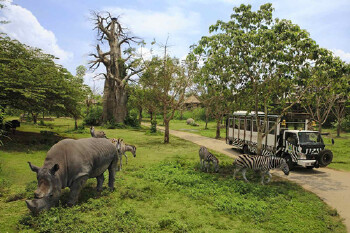 巴厘岛的野生动物园约有150种动物,占地40公顷,采用开放式豢养,其游客若要参观,方式就是乘坐观光车。观光车采用安全措施,车上有当地导游讲解,车窗可拉下,因此你可以给斑马之类温顺的动物喂食,但如果是狮子白虎就要当心了。或许是见惯了太多的人缘故,想猩猩之类的灵长类动物,甚至知道看见观光车就做各种表演和姿势让游客拍照,当然,拍完照后,它们会非常自觉地讨要东西吃。