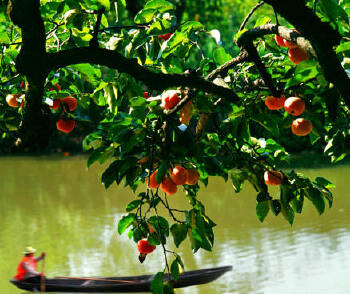 蓝天白云下,苍苍翠翠,一望无际的柿林,一粒粒橘黄的果点染了这幅美极的柿林秋色。有的柿树叶子已几乎落尽,只剩下一树丰硕的果实,伸向蓝天里,仿佛一盏盏红灯笼,高高挂在枝头,点亮了这片柿林的秋天,远眺好像一个个红灯笼挂在枝头。西溪水岸,红柿万株,红果累累,缀满枝头,乡村田园景色展现眼前,使西溪湿地显露别样风情。