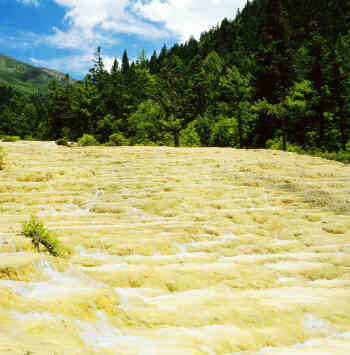 从洗身洞到婆萝彩池,有一道长约1500米,宽70-120米的钙化流,在目前世界上发现的同类形态中较壮观、较长、色彩较丰富,称为“金沙铺地”。左侧是盆景池,由一组近百个水池组成,池中有池,池外套池。池堤随树的根茎与地势而变,堤联岸接,活水同源,顺势层叠;池底呈黄、白、褐、灰多种颜色,池面澄净无尘,望若明镜;池旁池中,到处是木石花草,翠柏盘根,山花含笑,野果缤纷。这一片绚丽的景观,俨然天设地造的奇特盆景,使园艺师们也叹为观止。
