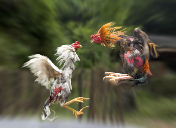 顾盼如电,抖翅生风,两鸡相搏,如武林高手对垒,战法斗技,灵活多变,腾闪击打,嘴腿并用,重爪烈翅,针锋相对。这小生灵对胜利的执著尤胜于人,往往不畏强敌,至死不休。虽为鸡,实则高傲如鹤,威猛似鹰,所以爱斗鸡者敬如国士,不惜千金以求一搏。