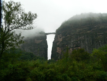 仙人桥架在相邻的两座山峰之间,曾经有六块条石悬架其上,现在条石无存,仙人桥下就是万丈深渊,云雾缭绕, “何仙姑回娘家——云里来雾里去”说得就是此处的仙人桥。传说此桥非凡夫俗子所能过,只有何仙姑乘架山岚,独来独往。仙人桥对面山脊的东侧,有一药王殿,旁边是用山石堆砌得十分齐整的墙壁,其上有一平地,名为茅庵,是道家修炼时散步放风的场所.