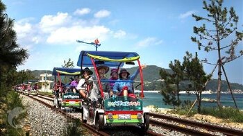 三陟海洋自行车是三陟市特有的,游客骑在带有4个轮子的自行车上,驰骋在海岸线的一种休闲运动。三陟市运营的铁路自行车,在安全系数上,要比其他任何地方 都高,少儿也可同行。整个路线介于宫村站与龙化站之间,全长往返大概10km,中途有休息所、展望台和海洋隧道等景点,特别是在海洋隧道内,华灯初放,将 会上演各种彩光秀。在这里也可以给予儿童学习大海生态的机会,是父母、恋人、朋友旅游的好去处。