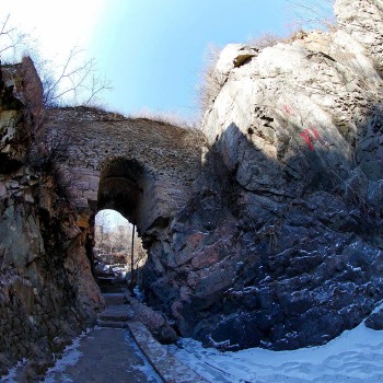 水门,也叫水关,修建于明万历年间,在古城堡的东侧,以山崖为基石,条石堆砌五层,条石上堆垒方砖,将之砌成拱形,上拱下方,造型精美,简洁明朗,质朴大方。远远望去,水门洞就像一弯在山腰升起的弦月,即使经历了几百年战火的洗涤,地震摇撼,山洪冲刷,都没有改变过它的造型,依然巍然屹立。水门下还有一条小溪潺潺而流,辗转流入关内的小青河。