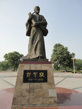 郭守敬的铜像双目炯炯有神,就像眼内蕴藏着其无穷的智慧;微翘的胡须,反映了郭守敬坚强的意志和他的实干精神,铜像手持图纸,分别代表着郭守敬伟大的四个方面:天文、水利、数学和仪器仪表的制造,天文卷上有四个圆点,是代表的星座,长袍被风吹起,飘然若动,反映其不仅是一位科学家,还是一位注重实践的实干家。
