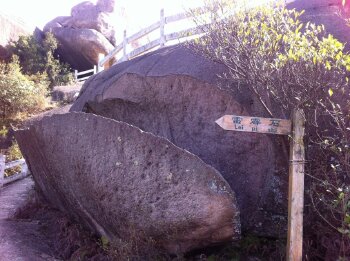 “断涧仙桥”的南面有一块巨石,石中有一通道,仅容一人侧身而过,其壁上刻有“雷霹石”字样。传说,仙桥建成后,如来走到桥端,突有巨石挡其路,如来便挥手将其劈为两半,也就现在的通道,但其实雷霹石是人工开凿的。穿过通道,就来到西方胜景。峰顶之上建有四殿一亭,小巧玲珑,典雅庄重。殿旁有明万历年间和清嘉庆年间的石碑各一块。
