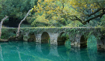 古桥坐落在景区前方,景区之名由此桥而得。这是一座小巧的七孔古石桥,古桥由整齐的麻石条砌成,桥身上爬满了藤蔓和蕨类植物;古色古香的桥下是绿得令来此的游人心醉的涵碧潭。两岸古木参天,无数的虬枝沿着古桥伸长手臂,就如有巨伞撑在桥上,为游人遮风挡雨。又因此桥传说是由七位姑娘捏成的,所以它还有一个传奇的别称叫“七姑桥”。此桥看起来单簿,但几百年来经历了多次洪水冲击却依然耸峙,迄今为止还无缺无损,可见其技术的精妙。