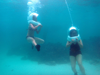 不需要会游泳,不需要任何经验,过程很简单,到海洋中间的一个平台,平台旁边有一个扶梯通往海底,教练会在扶梯旁守护,头上带一个透明的罩子,潜入到海里,接著您会不知不觉中闯入了鱼儿的家园,在海底有各种各样的小丑鱼、珊瑚礁、海葵、海星和珊瑚鱼,美丽极了。您的头上、脚边、眼前、身旁全都是身上有许多鲜艳条纹的鱼群们,活像穿了件迷彩服。鱼儿十分灵活,在您身边快乐地穿来穿去。