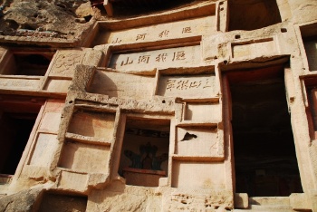 清代榆林著名书法家陈璋,曾写过:“三山拱翠”的匾额,形容榆林古城北依红山,东据驼峰,西临黑山的形胜。红山红石头,驼峰黄土丘,黑山黑土岭,三座颜色迥异的山拱卫着翡翠般碧绿的榆林城。到了红山,就可看见一座山门楼子,门洞上方镌刻着“红石峡”3字,这是我国著名美术家王森然先生的遗墨。越过门楼,首先扑面而来的是两边东西相峙的赭色石崖,崖壁上布满了石刻题匾和洞窟。沿壁根石阶而下,一条碧水穿峡而过,徜徉于双崖壁立的峡间。
