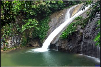 瀑布源头是一个因钙华沉积作用可逐渐长高而改变景致的瀑布。八级瀑布形态各异,有的如鸳鸯戏水,有的悬于长满青苔的岩壁上,瀑水如布,水纹清晰可鉴,尤如喷雾行云;有的水流集中下注跌入深潭溅起层层水雾浪花,尤如细雨蒙蒙,瀑布两岸荫蔽幽静,水质清洌,凉爽甘甜。山脚亚热带雨林浓郁,藤蔓垂壁,三千多亩的枫树和马尾松,鸟语花香,令人有回归自然的亲切感。