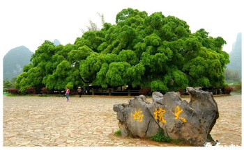历史上,这棵老榕树已有1400多年的历史,与阳朔县同龄。这棵千年古榕见证了无数时代的变迁,位于漓江风景区内,田园风光极佳,古榕的树冠呈圆形,远远望去便如一把巨大的绿色华伞,而近看则盘根错节,枝繁叶茂。在著名电影《刘三姐》中,三姐与阿牛哥便是在这棵树下抛绣球、定终身,成就了一段美好而浪漫的姻缘。古榕树下有一渡口,“榕荫古渡”为阳朔一景。